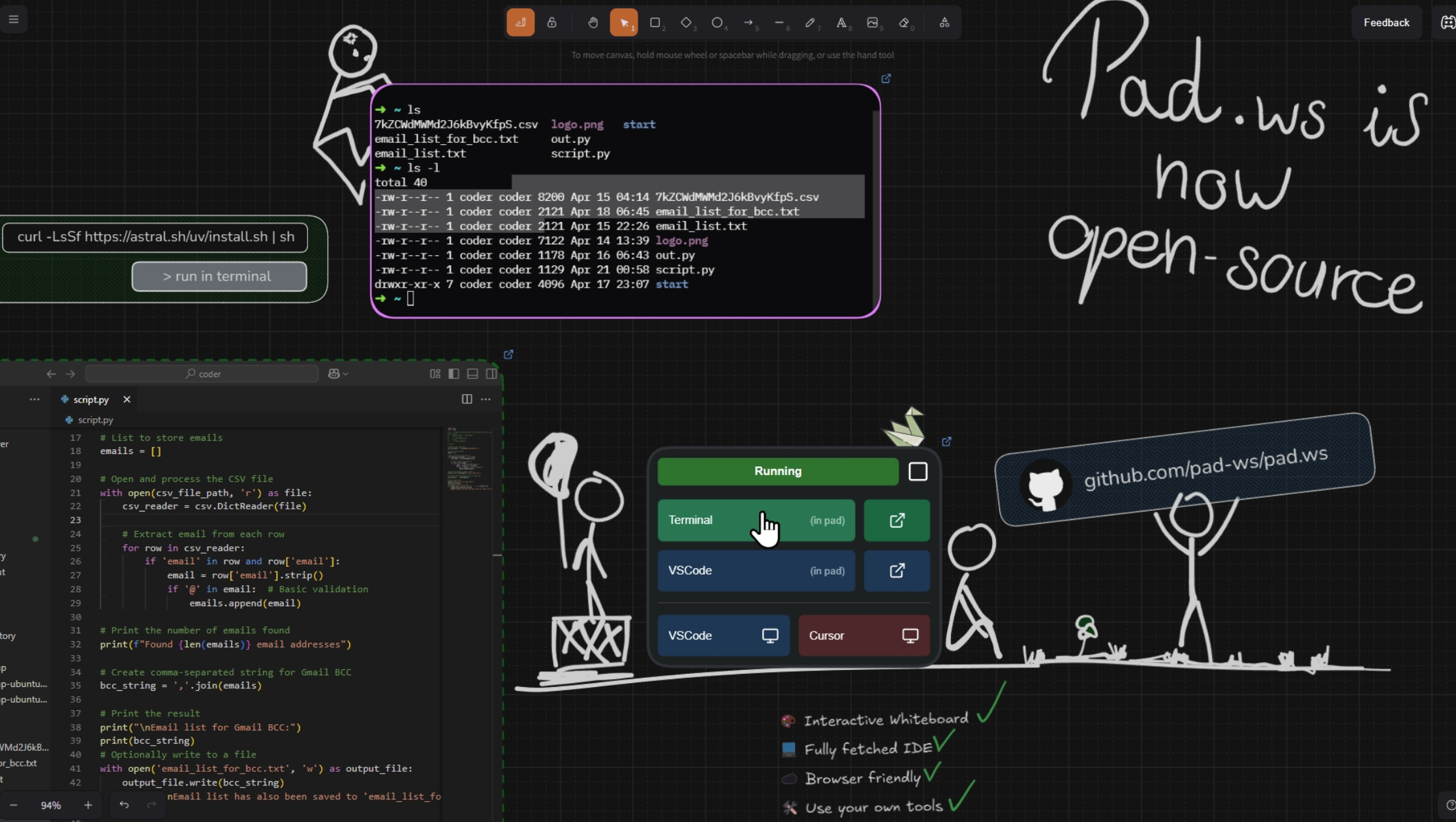 - 💻 功能完善的 IDE - 直接在白板上访问终端和 VS Code